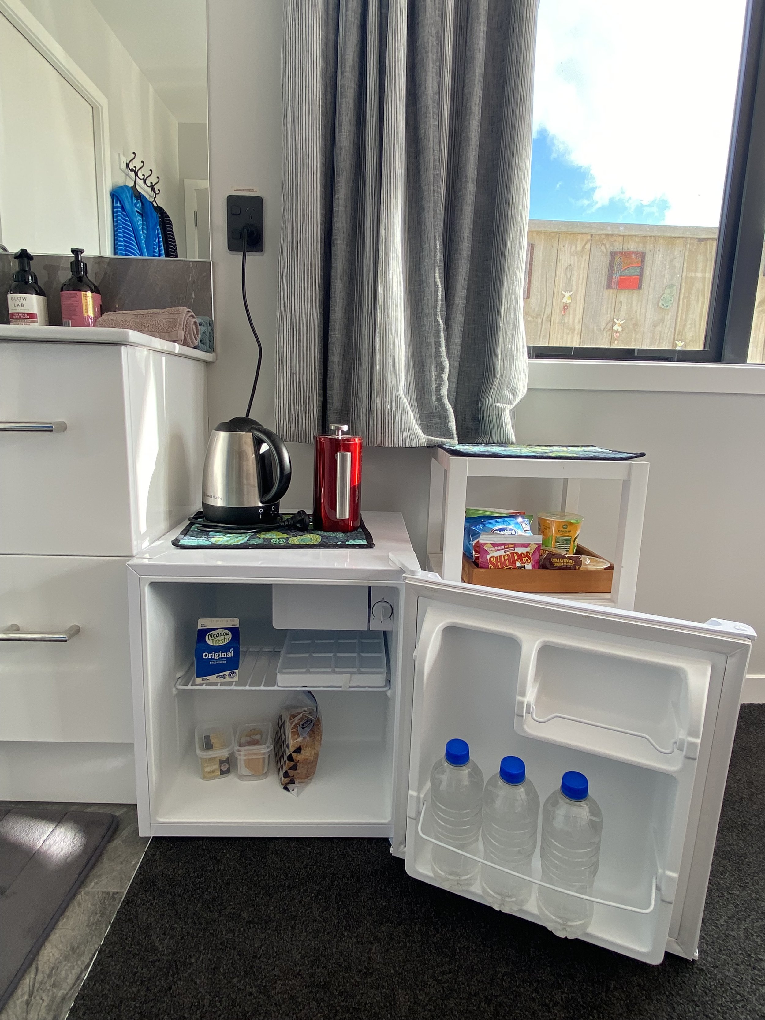 A basic continental breakfast is provided which is great for riders heading off for the day. There is a small fridge in the room, however if you are staying for more than one day and would like more milk or to store food in the bigger fridge located in the garage next to the room, you just need to ask. You can also access a washing machine and dryer if you ask.